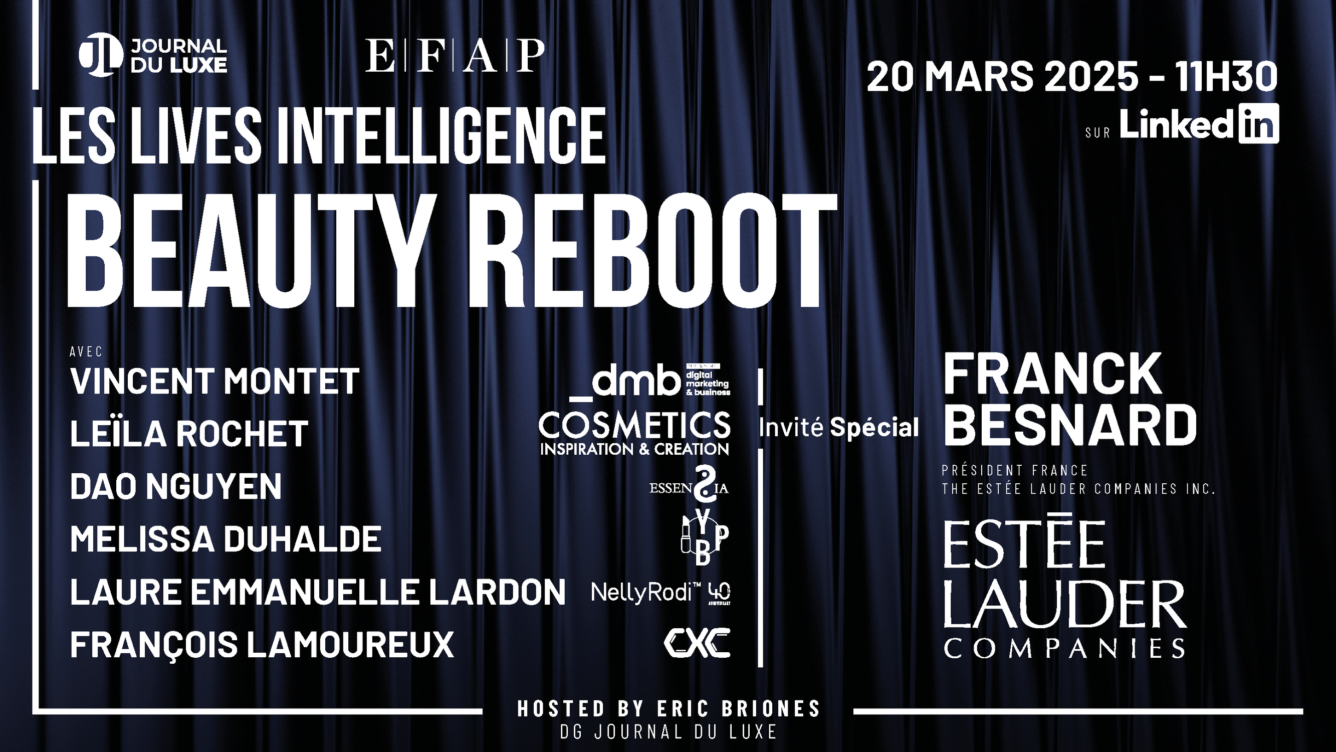 Pour répondre à toutes ces questions et échanger autour du monde de la beauté dans le luxe, retrouvez des invités d'exception, aux côtés d’Eric Briones, DG du Journal du Luxe :
