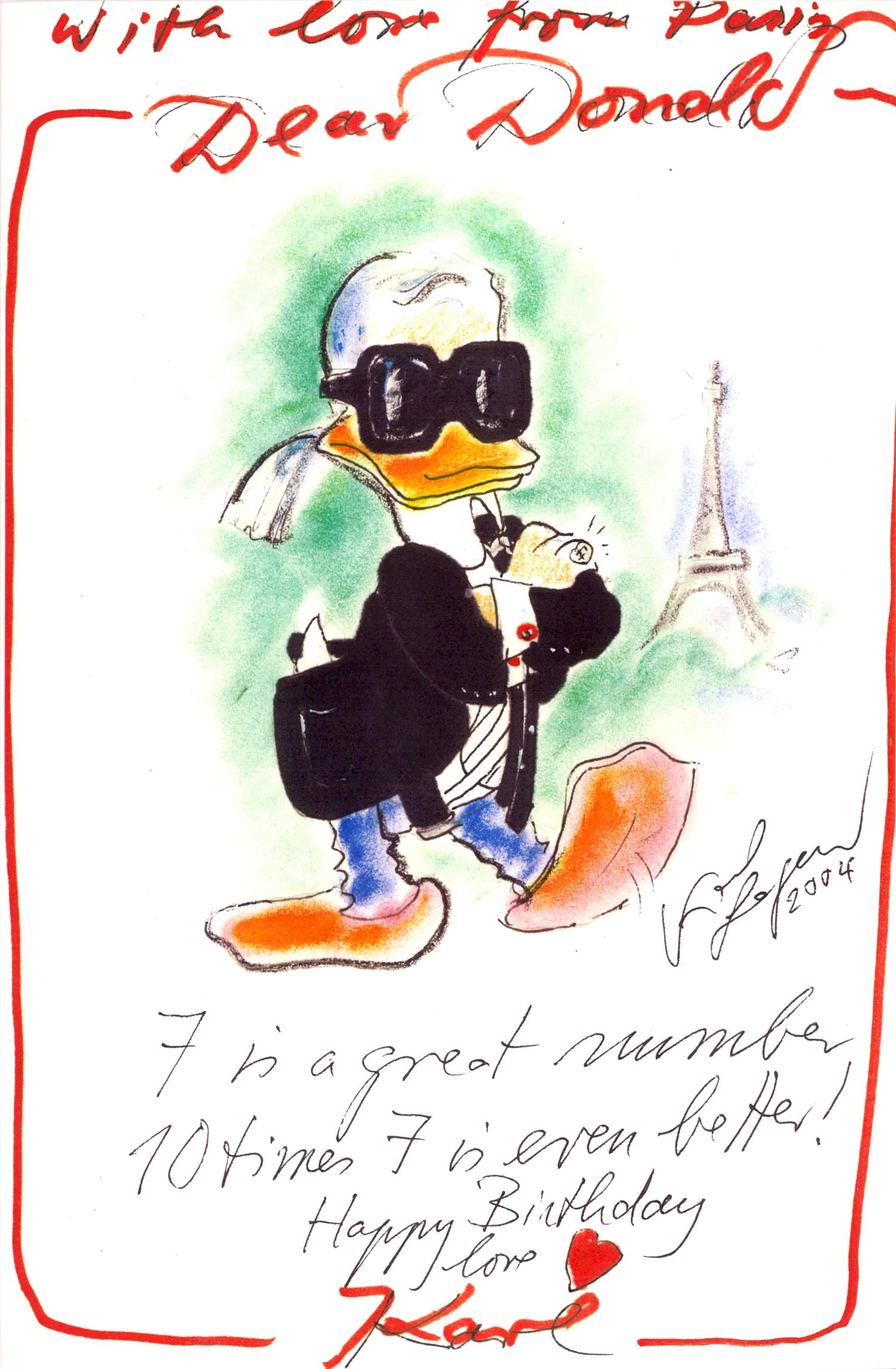 Un canard réinventé sous les traits du créateur : lunettes noires, costume noir et chemise blanc à col. C’est Karl Lagerfeld lui-même qui avait imaginé le personnage Disney de cette manière, comme on le découvre sur un croquis de 2004, partagé par la marque aujourd’hui. Un dessin rare qui, selon Pier Paolo Righi, directeur général de Karl Lagerfeld, illustre à la perfection "l'imagination et l'humour pointu du défunt designer allemand - c'est une véritable pièce de collection de nos archives".