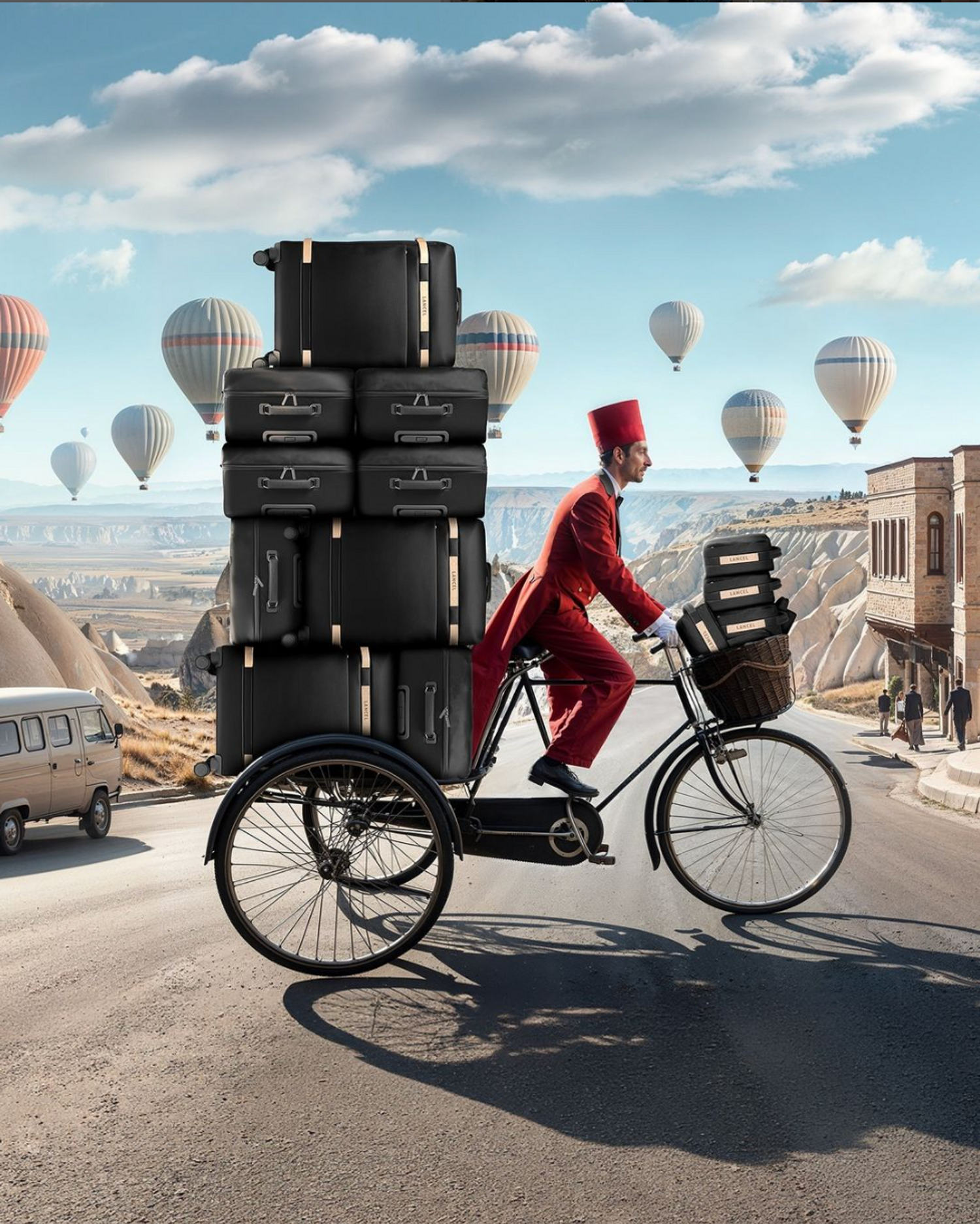 Lancel vient de lancer une campagne 100% Gen IA pour leur collection voyage, en collaboration avec Pencil. Promettant un voyage onirique entre Paris et le Mont Fuji, elle met en scène un porteur de bagages à bicyclette version Belle Époque.